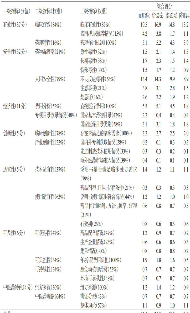 摘要 目的评价血脂康、脂必泰、脂必妥、降脂灵4种治疗高脂血症的中成药的临床综合价值,为临床合理用药提供依据。方法基于证据与价值对决策的影响(EVIDEM)框架和《心血管病药品临床综合评价技术指南(2022年版试行)》,建立临床综合评价指标体系;检索中国知网、万方数据、维普网、PubMed、ScienceDirect、Embase及相关官网,收集4种中成药的药品说明书、指南/共识、系统评价/Meta分析等相关文献,从有效性、安全性、经济性、适宜性、可及性、创新性和中医药特色7个维度进行综合评价。结果指标体系包含7个一级指标、15个二级指标和30个三级指标。血脂康的综合评价得分最高,为81.4分,为Ⅰ类推荐;脂必泰为76.0分,脂必妥为60.9分,均为Ⅱ类推荐;降脂灵为48.8分,为IV类推荐。结论血脂康用于高脂血症的临床综合价值最优;脂必泰在安全性和中医药特色方面具有一定优势;脂必妥各方面表现较为均衡;降脂灵评分较低。临床可根据实际情况及患者特点选择适宜的药品。