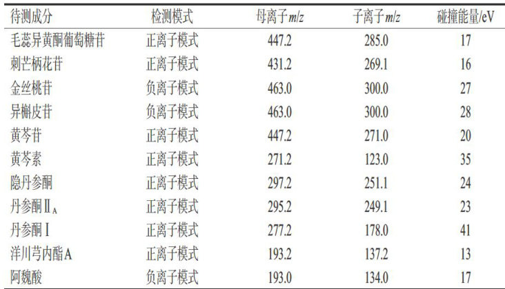 摘要 目的综合评价清热消癜方的质量,并筛选影响该方质量的潜在标志性成分。方法采用高效液相色谱-串联质谱(HPLC-MS/MS)技术测定清热消癜方中毛蕊异黄酮葡萄糖苷、刺芒柄花苷、金丝桃苷、异槲皮苷、黄芩苷、黄芩素、隐丹参酮、丹参酮 Ia, 丹参酮I、洋川芎内酯A、阿魏酸的含量;以上述成分含量为变量,采用OriginPro 2024及SIMCA14.1软件进行聚类分析(CA)、主成分分析(PCA)和正交偏最小二乘-判别分析(OPLS-DA),并以变量重要性投影(VIP)值 >1 且 P<0.05 为标准筛选影响清热消方质量的标志性成分;运用熵权-逼近理想解排序(TOPSIS)法和灰色关联分析(GCA)法对20批样品的质量进行综合评价。结果上述11种成分的含量分别为 7.993~72.866*4.542~31.228,727.666~1 901.884*496.846~1 293.279,1 995.501~1 6 779.150、54.500\~241.280、150.302\~304. 339,79.698~189.206,257.118~682.418,5.498~21.687,7.524~26.935μg/gob CA、PCA、OPLS-DA结果显示,20批样品聚为两类,Q1、Q3、Q4、Q7 ~ Q9、Q12、Q15、Q16聚为一类,其余聚为一类;阿魏酸、丹参酮 IA 黄芩苷、隐丹参酮、毛蕊异黄酮葡萄糖苷、刺芒柄花苷的VIP值 >1 且 P<0.05 。熵权-TOPSIS法和GCA法结果显示,欧氏贴进度最优解和相对关联度排前11位的样品包括Q2、Q5、Q6、Q10、Q11、Q13、Q14、Q17~Q20。结论 所建HPLC-MS/MS法快速准确、灵敏度高,结合化学模式识别分析及熵权-TOPSIS法、GCA法可用于综合评价清热消瘤方的质量。阿魏酸、丹参酮 Ia, 黄芩苷、隐丹参酮、毛蕊异黄酮葡萄糖苷、刺芒柄花苷可能为影响该方质量的标志性成分;Q17等11批样品的整体质量较优。