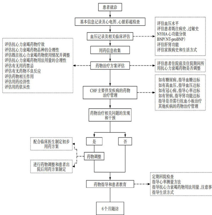 摘要 目的评价临床药师基于临床药学路径(CPP)参与慢性心力衰竭(CHF)治疗的效果。方法 选择2024年8月24日-2025年3月14日内蒙古科技大学包头医学院第一附属医院收治的226例CHF患者,按随机数字表法分为观察组和对照组,每组113例。所有患者均接受常规治疗,观察组患者在此基础上接受CPP管理(含住院期间药学监护、个体化出院用药方案制定、出院后药学随访)。比较两组患者入院时、出院时和出院3、6个月时的心功能指标、出院6个月时的治疗药物使用情况、经济指标以及出院6个月时的再入院率与死亡率;比较观察组患者入院时、出院时和出院3、6个月时的8条目Morisky用药依从性量表(MMAS-8)评分、躯体化症状自评量表(SSS)评分和患者健康问卷抑郁症状群量表(PHQ-9)评分。结果出院6个月后,共有24例患者脱落,最终观察组104例、对照组98例患者完成研究。与入院时比较,两组患者出院时和出院3、6个月时的美国纽约心脏协会(NYHA)心功能分级、左室射血分数、氨基末端脑利钠肽前体均显著改善,且在出院3、6个月时均显著优于出院时;同时,观察组出院时和出院3、6个月时的上述指标(出院时的NYHA心功能分级、氨基末端脑利钠肽前体和出院3个月时的NYHA心功能分级除外)均显著优于对照组( 1<0.05 )。观察组患者的血管紧张素转换酶抑制剂/血管紧张素Ⅱ受体阻滞剂/血管紧张素受体脑啡肽酶抑制剂使用率、β受体阻滞剂使用靶剂量的患者占比、钠-葡萄糖耦联转运体2抑制剂使用率及使用靶剂量的患者占比均显著高于对照组C ?<0.05 ),药占比、再入院率均显著低于对照组 ?P<0.05 )。与入院时比较,观察组患者出院时和出院3、6个月时的MMAS-8评分均显著升高,SSS评分、PHQ-9评分均显著降低 (P<0.05) ),且上述评分均随出院时间延长而逐渐降低 P<0.05 )。结论临床药师通过CPP可显著改善患者的心功能、用药依从性、躯体化症状和抑郁状态,提高血管紧张素转换酶抑制剂/血管紧张素Ⅱ受体阻滞剂/血管紧张素受体脑啡肽酶抑制剂、钠-葡萄糖耦联转运体2抑制剂使用率及β受体阻滞剂、钠-葡萄糖耦联转运体2抑制剂使用靶剂量的患者占比,降低再入院率。