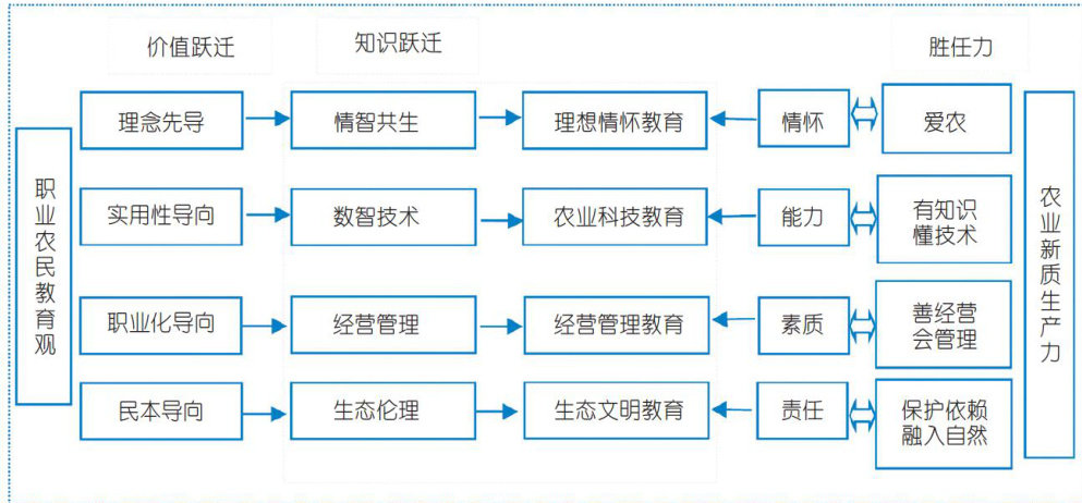 摘要在农业新质生产力变革背景下,农业人才供给与农业产业升级之间出现了“素质鸿沟”,职业农民教育体系正经历价值内核与知识结构的双重跃迁。与新质生产力相适应的人才供给体系需要突破传统的农民培训范式,注入数字基因,形成以理念先导、实用为本、职业进阶、民生关怀等价值元素构成的价值导向系统,并在新的教育价值观导向下,通过解析教育要素与新质生产力需求之间的适配规律,揭示职业农民教育范式跃迁的内在逻辑,创新以情智共生、数智技术、经营管理、生态伦理为核心要素的知识跃迁范式。