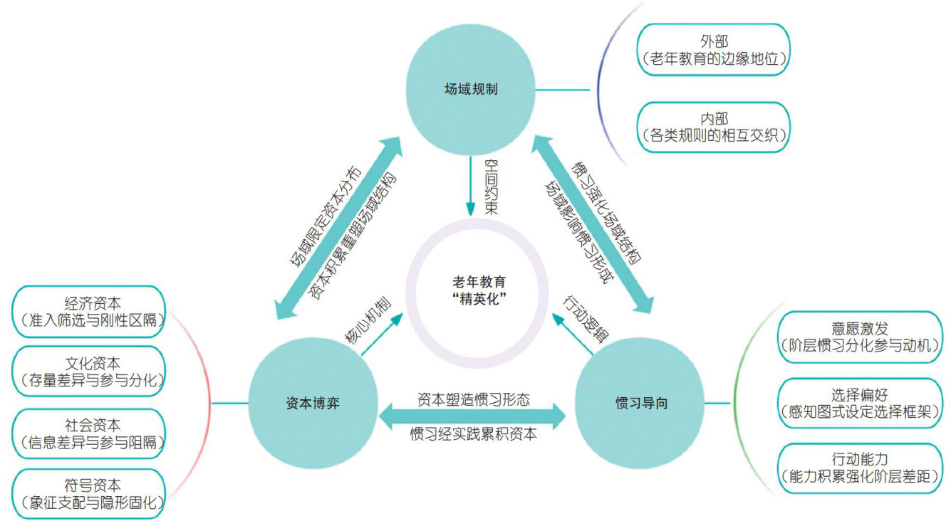 摘要推动老年教育多元普惠发展,是实施积极应对人口老龄化国家战略的内在要求和关键路径,对提升老年人生活质量、开发老年人力资源、构建老年友好型社会具有重要的现实意义。当前,老年教育在参与主体、资源获取和课程设置方面均呈现出“精英化”倾向。基于布迪厄场域理论,该现象的形成机制可归结为场域规制下的结构性约束、资本博弈中的资源分配不均以及惯习导向下的参与行为分化。推动老年教育从“精英化”向多元普惠转型,应从重构场域规则、优化资本配置、培育积极惯习和推进协同治理四个维度系统展开,打破“场域—资本一惯习”的固化循环,构建更加多元包容、普惠共享的老年教育发展生态。