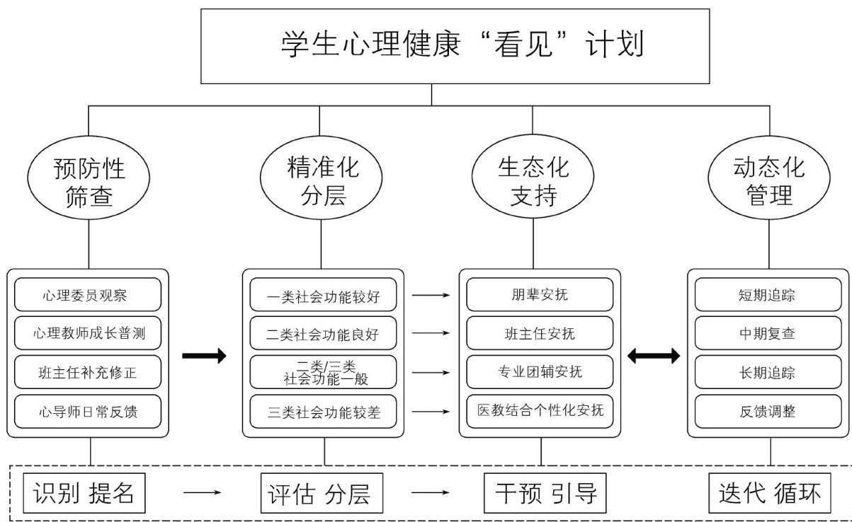摘要:宁波经贸学校基于人际沟通分析理论(TA理论),构建并推行学生心理健康“看见”计划。该计划聚焦“存在确认一共情联结一成长赋能”的逻辑主线,整合班主任、心理教师、心导师、学生朋辈群体及精神科医生等学生发展资源,形成预防性筛查、精准化分层、生态化支持、动态化管理的全链条服务体系,实现心理工作从“被动应对”向“主动赋能”的转型,有效促进学校心理工作与育人目标的深度融合。