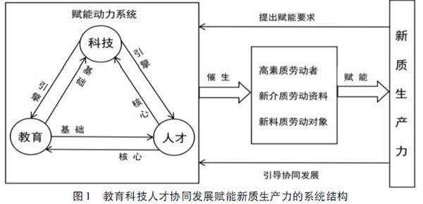 内容提要 教育科技人才协同发展是“统筹推进教育科技人才体制机制一体改革”的必然要求,是“健全因地制宜发展新质生产力体制机制”的战略举措,既符合马克思主义生产力理论的方向指引,又辩证汲取了国内外生产力发展的实践经验,也观照了新质生产力发展的现实环境。教育科技人才协同发展赋能新质生产力,构成了以新质生产力发展为目标以及教育科技人才协同发展为动力的系统,其中教育、科技、人才在赋能动力系统中分别处于基础、