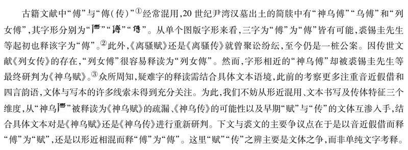 内容提要 学界以音近假借释《神乌傅》之“傅”为“赋”。揆诸文献,汉简“傅”“傳”形近混用现象普遍存在,如尹湾、敦煌、悬泉汉简的“列女傳(传)”之“傳”皆为“傅”。《神乌傅》文体遵循史传“君子曰”阐释框架,叙事逻辑与《史记·龟策列传》高度同构,从而形成“《神乌傳》—《汉书·五行志》—《搜神记·乌斗》”传体谱系,在后代为动物立传的《三友传》中亦见对其叙事模式的回应。由此,“傅”“赋”相通之反证、“傅”