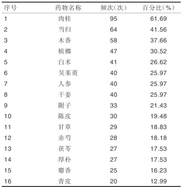 摘要目的:收集《太平圣惠方》中治疗胸痹心痛的方剂,总结其用药规律。方法:检索《太平圣惠方》中治疗胸痹心痛的方剂,建立数据库,将纳入方剂借助 Excel2019进行药物频次统计,利用古今医案云平台(V2.3.5)进行性味归经统计、功效统计、关联规则分析,通过Cytoscape 3.7.2软件构建中药核心复杂共现网络。结果:共收集154首方剂,包括184味中药,总用药频次1199次,高频使用药物有肉桂(95次)、当归(64次)、木香(58次)、槟榔(47次)、白术(41次)、吴莱萸(40次)、人参(40次)、干姜(40次)等;四气11种,以温、平、大热为主;五味涉及12种,其中辛、苦、甘占比最大;归经以脾、胃经为主;功效分类307种,散寒止痛、补火助阳最为常见;关联规则分析获得7种高频药对,当归-肉桂、木香-肉桂、吴莱萸-肉桂位居前3位,常用药物可聚为5类,复杂网络分析筛选出当归、肉桂、木香、槟榔、吴莱萸、人参、白术、干姜、赤芍9种中药,药物多有温阳、理气、活血、益气之效。结论:初步探索出《太平圣惠方》中治疗胸痹心痛方剂的用药规律以“通”为治疗原则,重用气味辛苦甘温之品以温阳通脉、活血通脉、行气通脉,气血同调思想突出。