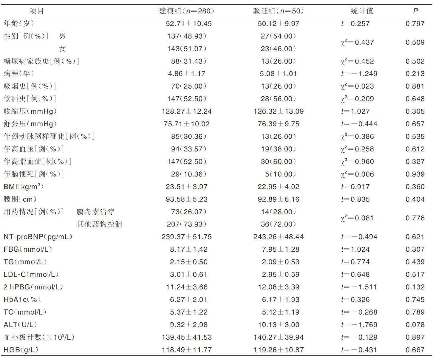 摘要目的:分析2型糖尿病(T2DM)病人心血管事件(CVE)的影响因素,并进行风险预测模型的构建与验证。方法:选取2017年12月—2019年12月河北省秦皇岛市第一医院收治的T2DM病人330例,其中280例作为建模组,将随访2年中发生CVE的病人作为CVE组,未发生CVE病人作为非CVE组,比较两组临床资料。建模完成后,将剩余50例病人作为验证组。采用多因素Logistic回归分析T2DM病人发生CVE的影响因素,再应用R软件建立各影响因素列线图预测模型,并进行验证。结果:纳入研究的280例T2DM病人,在随访期间34例病人脱落,51例病人出现CVE,CVE发生率为 20.73% 。CVE组年龄和腰围大于非CVE组( P<0.05) ,吸烟史占比、舒张压、三酰甘油(TG)、低密度脂蛋白胆固醇(LDL-C)和糖化血红蛋白(HbA1c)高于非CVE组( P<0.05 )。经多因素Logistic回归分析显示,年龄( OR=1.121 )、吸烟史( OR=5.946 、舒张压( OR=1.087 、腰围( OR=1.424 、TG(OR=8.690)、LDL-C( OR=7.186 和HbA1c(C )17=2.411 )是T2DM病人发生CVE的独立危险因素。进一步将年龄、吸烟史、舒张压、腰围、TG、LDL-C和HbA1c这些预测T2DM病人发生CVE风险的影响因素纳入列线图,预测T2DM病人发生CVE风险的C-index为 0.921 。受试者工作特征(ROC)曲线显示,LDL-C和腰围预测T2DM病人发生CVE风险的诊断效能高于年龄、舒张压、TG和HbA1c。列线图校准曲线斜率接近1,结果显示列线图模型预测T2DM病人发生CVE风险与实际观察的区分度和一致性良好。结论:包括年龄、吸烟史、舒张压、腰围、TG、LDL-C和HbA1c变量的列线图预测模型可有效预测T2DM病人发生CVE的风险。