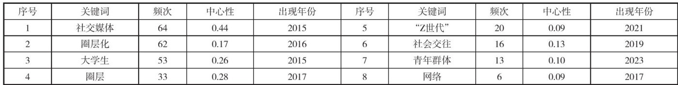 摘要:“轻社交”现象正以其边界感强、低情感投入等特征,在大学生群体中广泛流行。本文利用CiteSpace软件对国内“轻社交”文献展开研究,结合时序统计、学科分布和关键词共线分析,阐释了其研究现状;利用关键词聚类和突变分析,总结了其前沿演进。研究表明,大学生“轻社交”现象研究可分为三个发展阶段;关注于社交媒体、大学生、圈层化、网络社交等时代热点;归纳于对象主体、平台媒介、特征表现和应对路径4个方面;集中在社交新媒体全覆盖、高校大学生准聚焦、网络算法治理延伸3个方向。