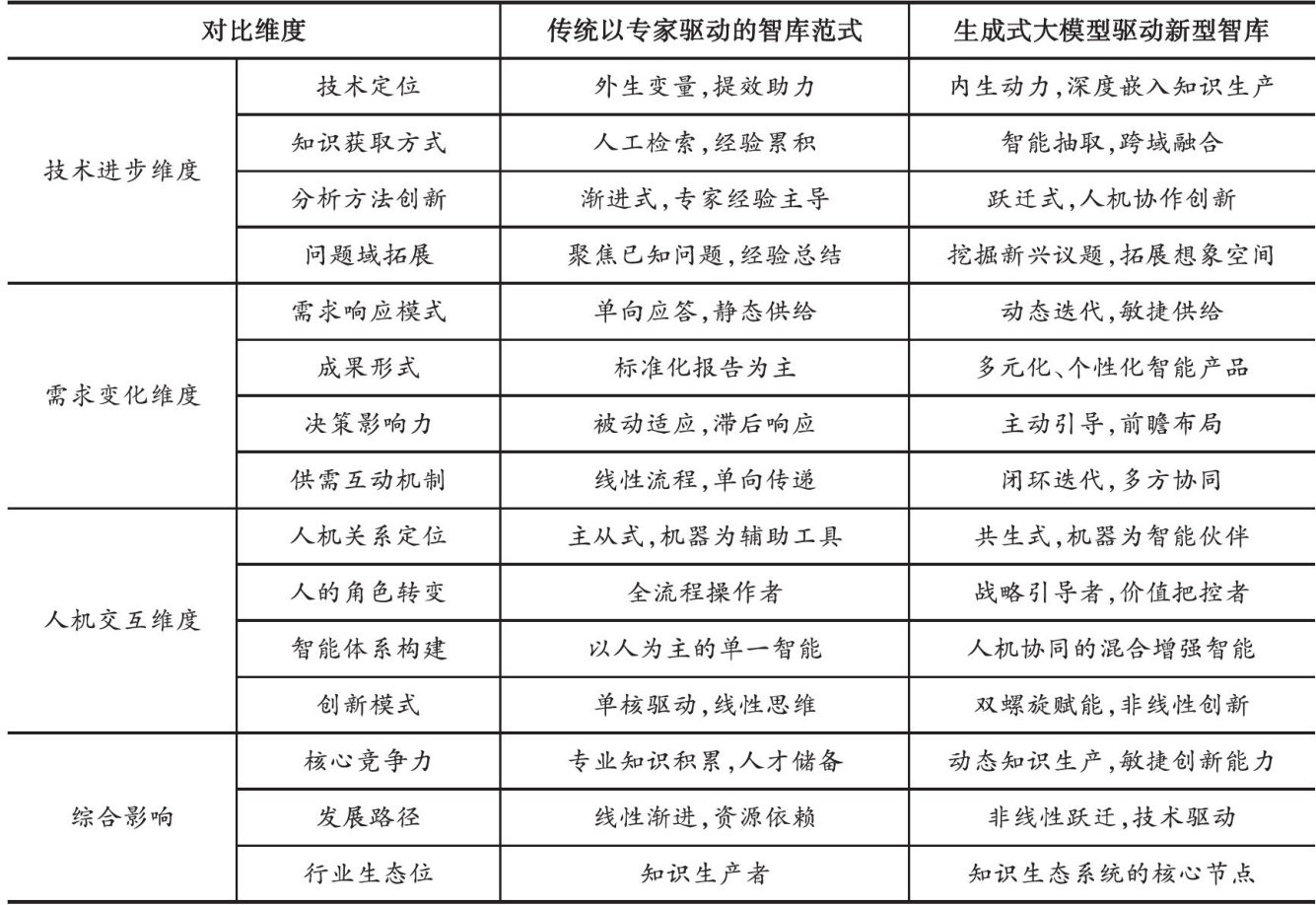 摘要:以生成式大模型为代表的人工智能技术正在重塑智库知识生产范式。基于理论研究与实践探索的双重维度,通过全面剖析生成式大模型在智库知识生产流程、方法、成果形态等方面的应用现状发现,生成式大模型正在为智库角色转型提供历史性机遇,推动智库知识生产从传统的专家经验依赖走向人机混合驱动,从粗放式的“手工作坊”走向智能化的“精益生产”,形成知识获取智能化、分析范式协同化、成果形态多元化的系统性变革。在此过程中,智库功能正由单一“思想库"跃升为集数据、算力、人才于一体的"赋能枢纽”。为顺应这一趋势,智库应将智能化转型纳入顶层战略设计,构建“智库 + 大模型”的融合范式,在人机协同、万物互联的智能时代彰显其“中枢"价值,从而为新时代国家治理现代化提供新型智力支撑。