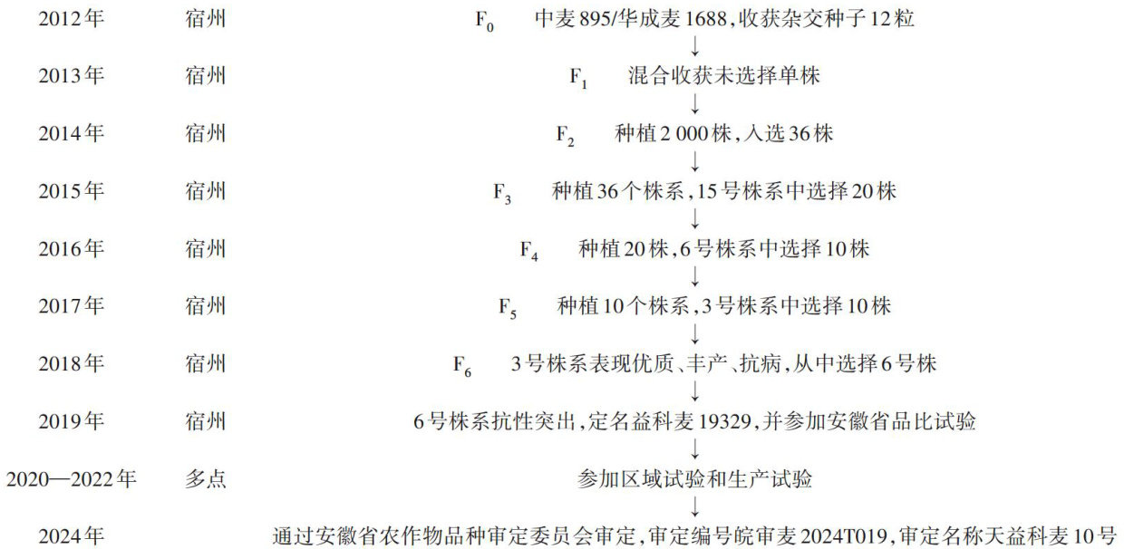 摘要本文总结了天益科麦10号的选育过程、特征特性及栽培技术要点,该品种是以中麦895为母本、华成麦1688为父本,经过系谱法选育而成的小麦品种,2024年通过安徽省农作物品种审定委员会审定(皖审麦2024T019)。2年区试和1年生产试验表明,该品种分藥成穗率中等、熟相好,平均产量达 9537.50kg/hm2 ,为中筋小麦品种,中抗赤霉病、感纹枯病。其在沿淮淮北地区的栽培技术要点包括采取深翻旋耕精细整地,适宜播期在10月10—25日,播种量 135~150kg/hm2 ,播种深度 3~5cm ;科学运筹返青肥、拔节肥和穗粒肥,结合不同苗情合理追施氮肥与叶面肥;水分管理确保足嫡播种,适时进行越冬灌水和拔节孕穗期灌水;病虫草害防治以预防为主,播前清除病源,生长期重点防治锈病、赤霉病、蚜虫及杂草,关键时期精准用药;蜡熟末期进行机械收获,籽粒水分降至 13% 以下时可安全入仓储藏。本文为该品种在适宜区域的推广种植提供参考。