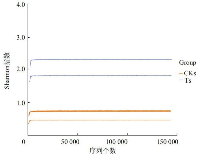 摘要为研究茄子青枯病对植株茎秆内生细菌群落结构及多样性的影响,供试茄子品种为紫红04,试验设置感病植株茎秆(Ts)和未感病植株茎秆(CKs)共2个处理,3次重复。利用高通量测序技术进行Alpha多样性分析、细菌门和属水平分类组成分析。结果表明,样品有效序列总数在 188979~210091 个,细菌OTUs总数在179~454 个。Ts处理的平均Chao1指数较CKs低 24.81% ,Ts处理的Shannon指数较CKs高 220.43% ,说明与健康植株相比,感病植株降低了细菌菌群丰富度,提高了菌落多样性。在细菌门水平下,CKs处理蓝菌门(Cyanobacteria)的相对丰度占比 98.16% ,较Ts处理高49.11个百分点;Ts处理的变形菌门(Proteobacteria)的相对丰度占比 50.68% ,较CKs高49.19个百分点。在细菌属水平下,CKs处理的茄科茄属(Solanum torum)的相对丰度占比 94.12% ,较Ts处理高47.68个百分点;Ts处理的劳尔氏菌属(Ralstonia)的相对丰度 (43.89% 较CKs处理(0.01% )高43.88个百分点。综合表明,与健康茄子茎秆相比,感染青枯病植株茎秆的内生细菌菌群丰度和有益菌丰度明显降低,菌落多样性和有害菌丰度明显增加。本文为后期在土壤和植株上精准防控茄子青枯病提供参考。