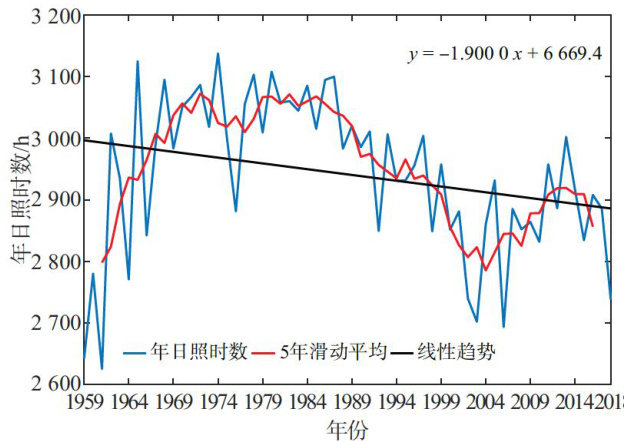 摘要本文基于内蒙古自治区乌兰察布市1959—2018年日照时数观测数据,利用趋势分析、滑动平均法、Morlet小波分析和Mann-Kendall检验等分析方法,分析了该地区日照的年和季节变化趋势、空间分布特征和周期变化,以及其对农作物产量的影响。结果表明,(1)1959—2018年研究区平均日照时数年变化总体呈降低趋势,四季变化中只有春季的年日照时数与日照百分率 ?60% 日数呈小幅上升趋势;(2)日照时数与日照百分率≥60% 日数空间分布均呈由南向北递增趋势;(3)年日照时数在1997年发生突变,存在22、31、12和4年的震荡周期;(4)日照百分率与小麦产量呈正相关,与薯类产量呈负相关,相关系数分别为0.56和-0.63。本研究为农作物种植结构优化与气候适应性管理提供参考。