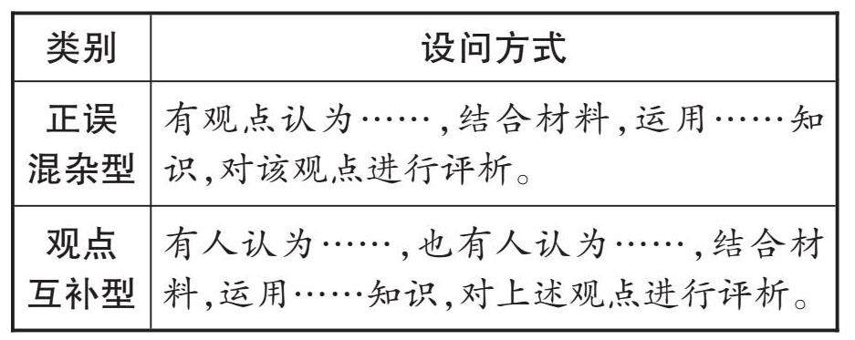 [题型特点] [解题方法] 解答评析类主观题要先找到辨点,拆分设问,再结合材料和所学知识进行分析,最后指出该怎么办。 1. 正误混杂型解法: 2. 观点互补型解法: [典例展示] 阅读材料,完成下列要求。 材料一 基础设施是经济社会发展的重要支撑。中央提出,持续推进重点领域补短板投资,加快交通基础设施建设、完善社会民生基础设施等;系统布局新型基础设施,加快建设