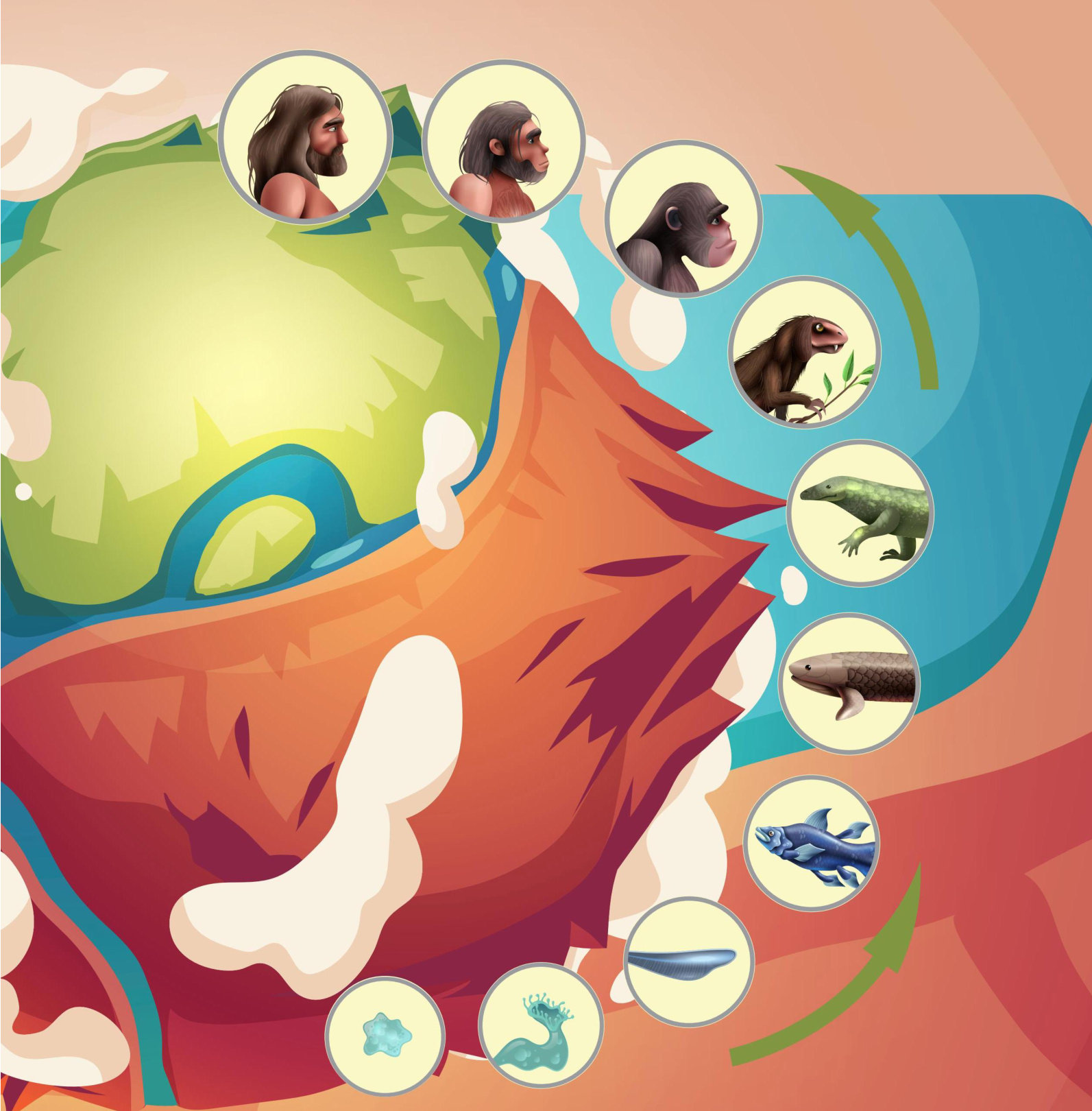 指导教师 向高艳 "3、2、1,启动!”我按下时光机的启动键阵天旋地转后,我竟闯入地球诞生之初的寒武纪 这颗年轻星球的模样与现代截然不同。天空混沌,厚重的云层如灰色的幕布,偶尔透出几道微弱的阳光,给大地蒙上一层神秘光晕。大地被炽热的岩浆和荒芜的岩石占据,地表温度极高,滚烫的热气不断升腾,空气中弥漫着刺鼻的硫磺味。 不过,最震撼的是海洋一一生命最初的摇篮。寒武纪的海洋,远非现代这般宁静湛蓝,而