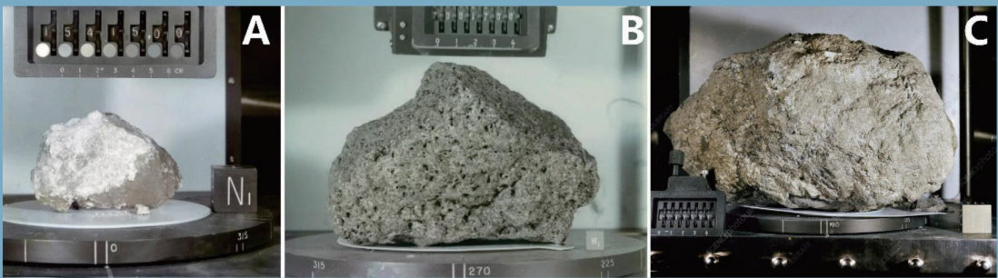 月球三大类岩石:A.阿波罗15号采集的高地斜长岩,被称之为GenesisRock(创世石);B.阿波罗17号采集的月海高钛玄武岩;C.阿波罗16号采集的月球角砾岩,称之为BigMuley,是月球角砾岩样品中最重的一块(11745克)。(图片来源:天上的玉盘,到底什么模样?,2025) 小时候我就好奇嫦娥的月宫真的有玉兔吗?除了嫦娥和玉兔,月宫还有什么?今年中央电视台春节联欢晚会上孩子们带着对