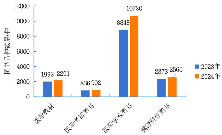 当前,面对卫生健康图书市场的深刻变革、读者需求的多元拓展、技术变革的深度融合以及出版形态的加速创新,卫生健康图书出版亟须把握机遇、应对挑战。 图书是出版物的主要形态,图书出版是当前出版单位的主要业务。本研究以卫生健康图书为研究对象,将其进一步细分为医学教材、医学考试图书、医学学术图书和健康科普图书四种基本类型,以2023—2024年国家版本数据中心数据服务平台的在版编目(CIP)数据和北京开卷信