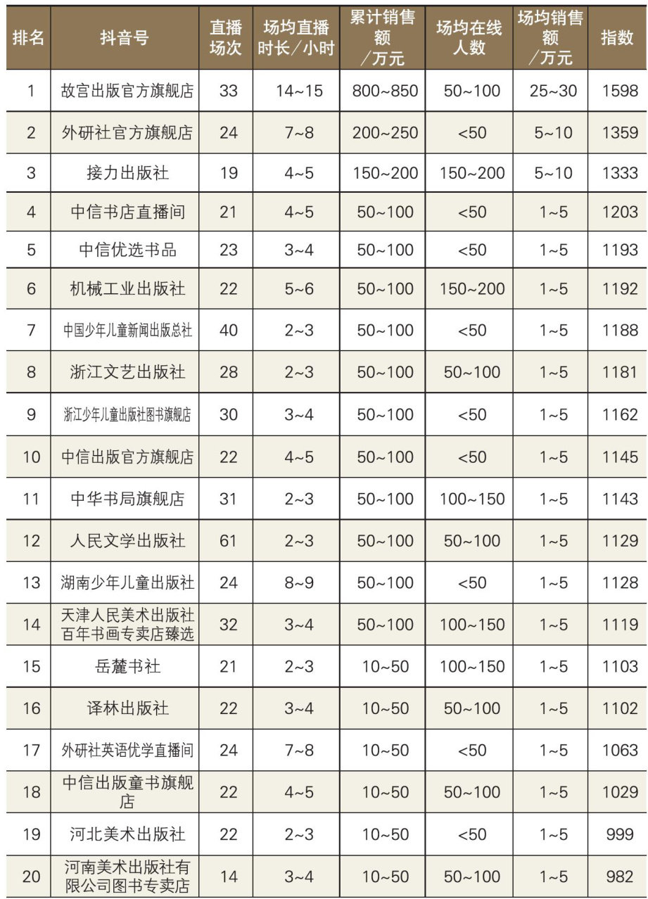 本期321个书业账号开启直播带货,占比 40.79% 。 本文统计了2025年10月15日至11月14日,包含出版社、图书公司、渠道在内的出版、发行机构抖音账号短视频和直播的表现情况。 表1出版社自播带货能力排行榜 在《出版人》杂志监测的787个出版、发行机构账号中,本期开启带货直播的共计有321个,占比 40.79% 。本期月累计销售额超1000万元的有“宝宝巴士官方旗舰店”;在500
