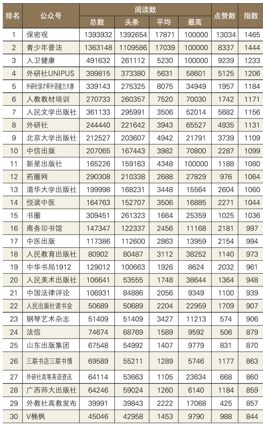 本期书业微信公众号整体表现有所回升。 表1出版社微信公众号影响力排行榜 本文统计了2025年10月15日至11月14日,出版社、图书公司和渠道的微信公众号(订阅号)表现情况。 本期监测的343个出版社账号共计发布作品6923篇,总阅读量超1043万次,相比上期增加160万次;有55个账号在监测期内处于停更状态,活跃账号日更0.78篇文章。100个图书公司账号共计发布作品1680篇,总阅读